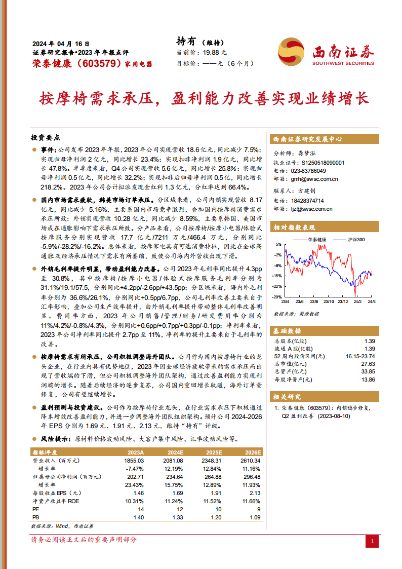 荣泰健康在2023年面临全球按摩椅市场需求疲软的挑战,导致营收同比下滑。然而,公司通过有效的成本控制、生产效率提升以及汇率的有利影响,显著改善了盈利能力,实现了归母净利润和扣非净利润的逆势增长,毛利率和净利率均有明显提升。公司积极调整海外团队架构以应对市场变化,并预计随着经济复苏,未来营收和利润将恢复增长。基于对公司未来业绩的预测,分析师维持“持有”评级,并提示相关市场风险。