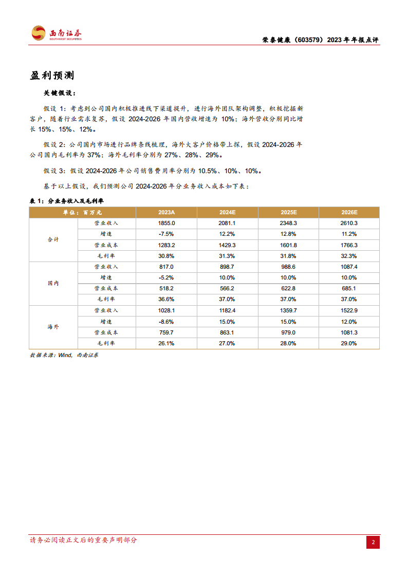 综合考虑公司作为按摩椅行业龙头在需求承压下积极降本增效、改善盈利能力以及调整海外团队组织架构的策略,预计公司2024-2026年每股收益(EPS)分别为1.69元、1.91元、2.13元。分析师维持对荣泰健康的“持有”评级。同时,报告提示投资者关注原材料价格波动风险、大客户集中风险以及汇率波动风险。