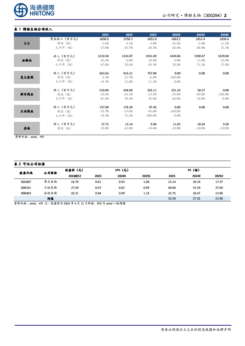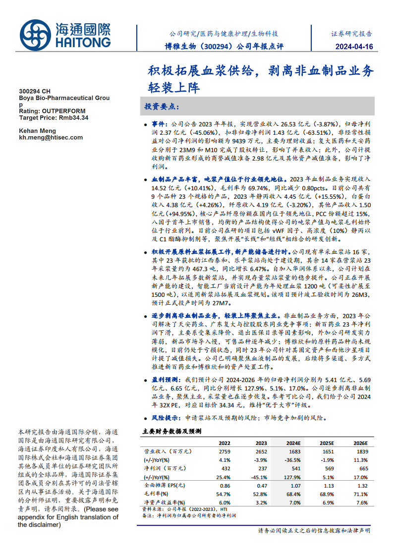 基于公司逐步剥离非血制品业务、聚焦主业以及采浆量逐步恢复的战略,预计2024-2026年归母净利润分别为5.41亿元、5.69亿元和6.65亿元,同比分别增长127.9%、5.1%和17.0%。参考可比公司估值,给予公司2024年32倍PE,对应目标价34.34元,维持“优于大市”评级。主要风险包括申请浆站不及预期和市场竞争加剧。