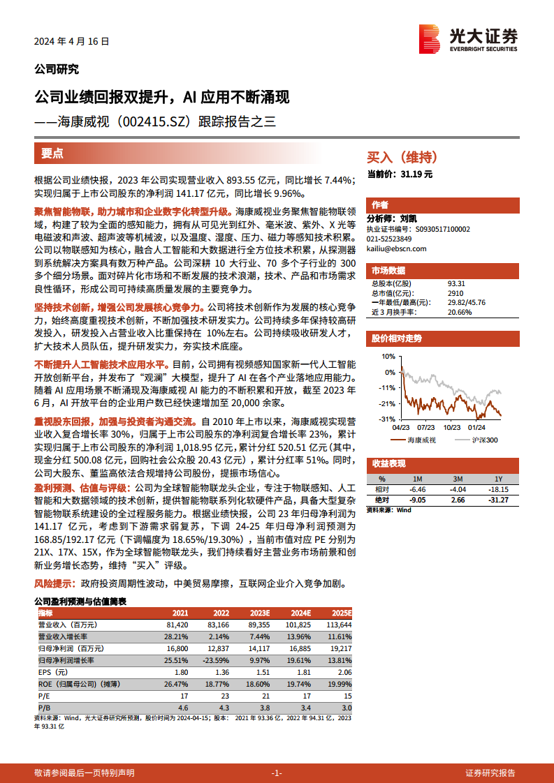 海康威视作为全球智能物联领域的领导者,在2023年实现了营收和净利润的稳健增长,充分展现了其强大的市场地位和盈利能力。公司通过持续聚焦智能物联核心业务,并坚持高比例研发投入以强化技术创新,特别是在人工智能和大数据领域的深度融合与应用,成功推出了“观澜”大模型,并显著扩大了AI开放平台的用户基础,进一步巩固了其核心竞争力。在保持业务增长的同时,海康威视高度重视股东回报,通过持续高比例分红和管理层增持等措施,有效回馈投资者并增强市场信心。尽管公司面临政府投资周期性波动、中美贸易摩擦以及互联网企业竞争加剧等潜在风险,但凭借其在智能物联领域的深厚积累和持续创新能力,预计未来仍将保持良好的增长态势。基于此,分析师维持对海康威视的“买入”评级。