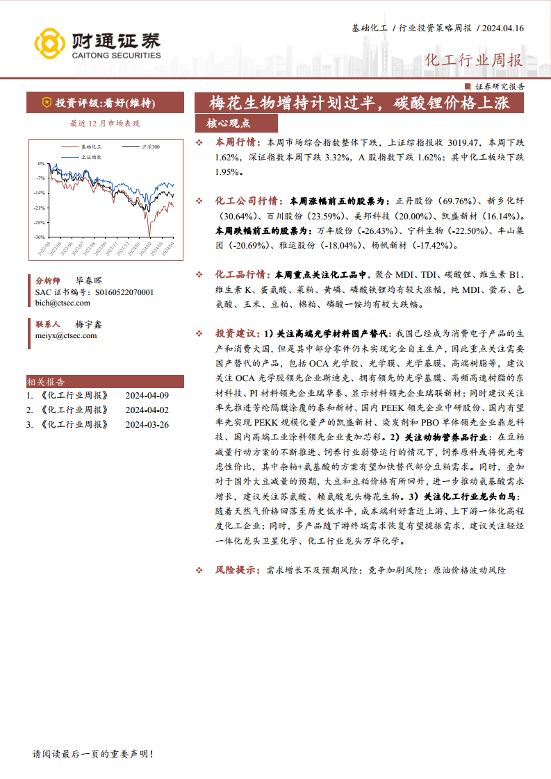 化工行业周报:梅花生物增持计划过半,碳酸锂价格上涨