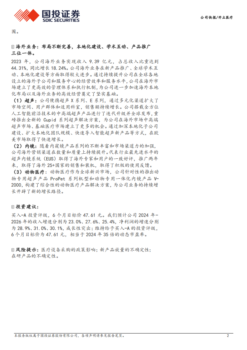 国投证券维持开立医疗“买入-A”的投资评级,并给予6个月目标价47.61元。预计公司2024年至2026年的收入增速分别为23.0%、27.6%、25.4%,净利润增速分别为28.9%、31.0%、30.1%,显示出突出的成长性。目标价相当于2024年35倍的动态市盈率。