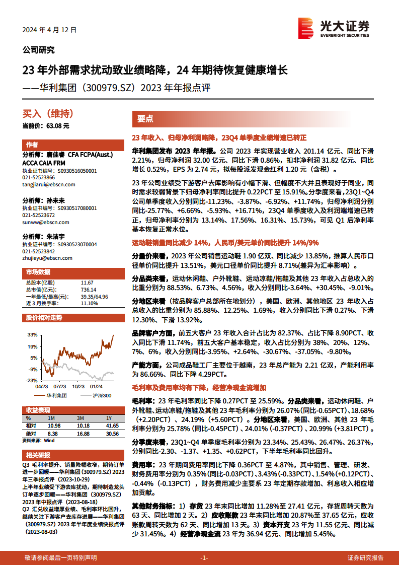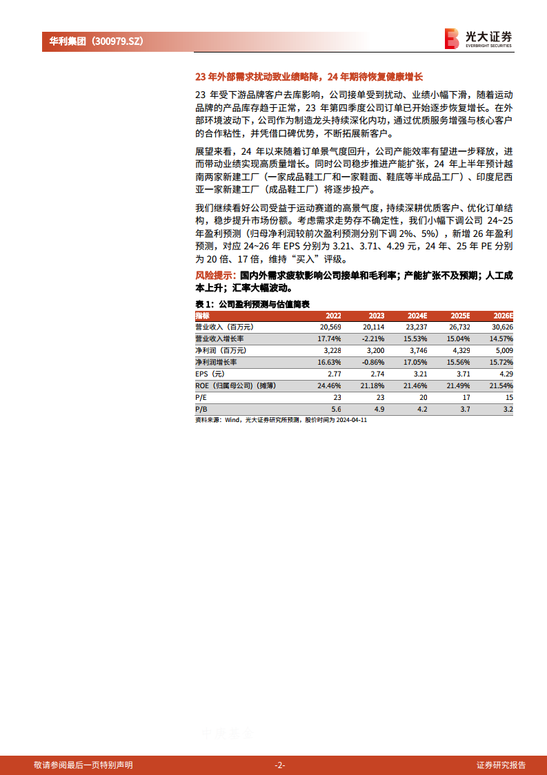 分析师继续看好公司受益于运动赛道的高景气度,持续深耕优质客户、优化订单结构,稳步提升市场份额。考虑到需求走势仍存在不确定性,分析师小幅下调了公司2024-2025年归母净利润预测(分别下调2%和5%),并新增了2026年盈利预测。预计2024-2026年EPS分别为3.21元、3.71元、4.29元,对应2024年、2025年PE分别为20倍、17倍。报告维持对华利集团的“买入”评级。