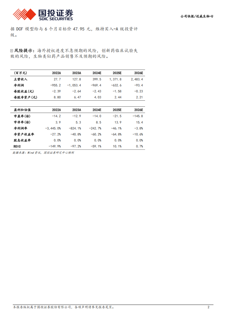 国投证券维持迈威生物-U“买入-A”投资评级,并给予6个月目标价47.95元。预计公司2024年至2026年的收入将分别达到4.00亿元、13.72亿元和24.83亿元,净利润分别为-9.69亿元、-6.33亿元和-0.93亿元。尽管短期内仍面临亏损,但考虑到公司已上市/即将上市产品的放量潜力以及丰富的临床研发管线,公司未来发展前景可观。