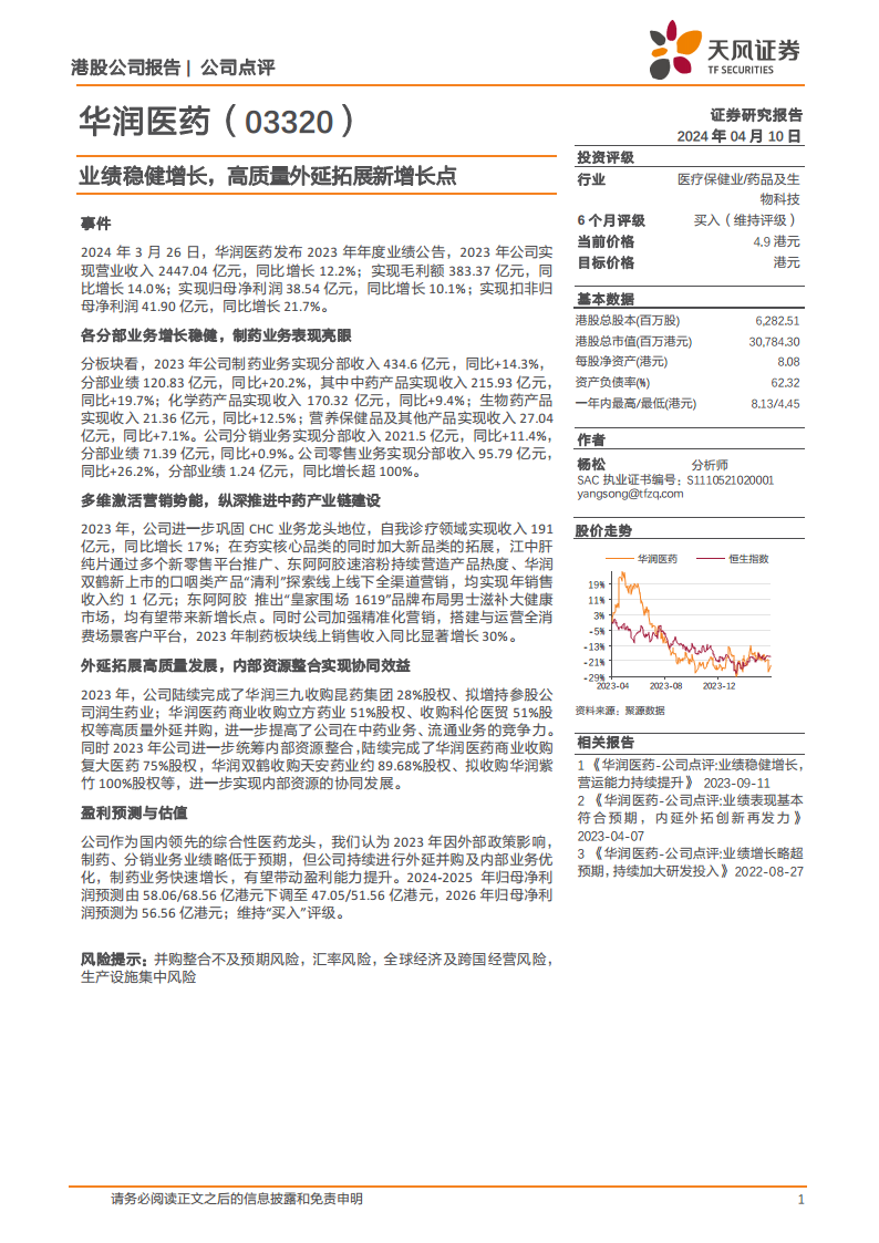 华润医药(03320):业绩稳健增长,高质量外延拓展新增长点
