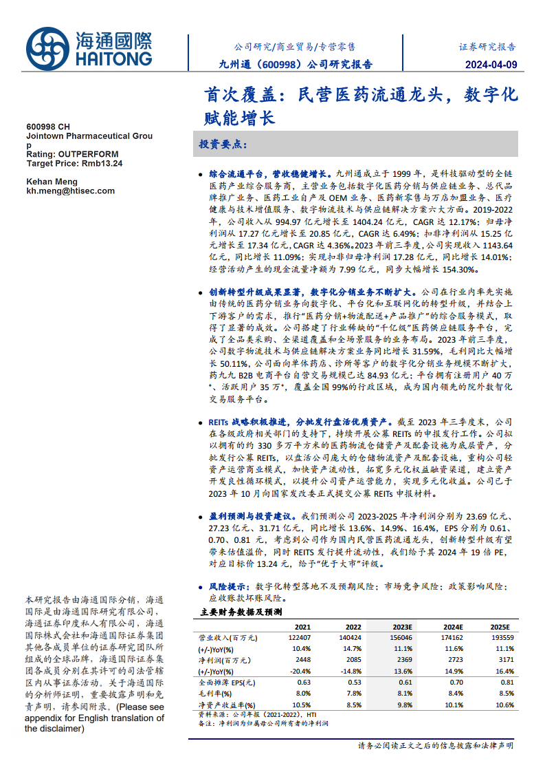 九州通(600998)首次覆盖:民营医药流通龙头,数字化赋能增长