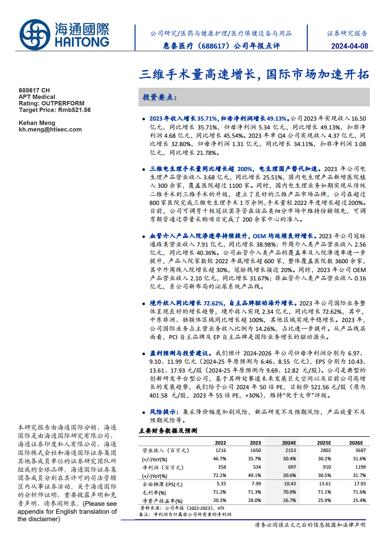 惠泰医疗(688617):三维手术量高速增长,国际市场加速开拓