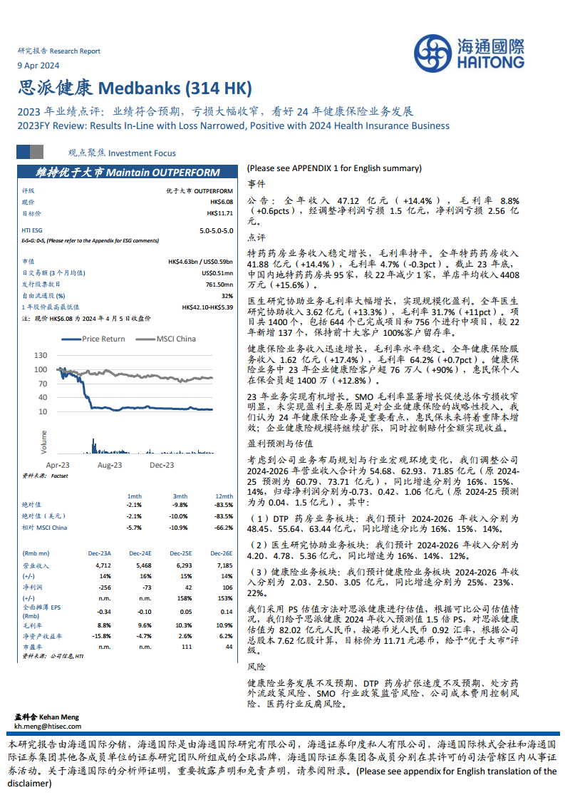 思派健康(00314):2023年业绩点评:业绩符合预期,亏损大幅收窄,看好24年健康保险业务发展