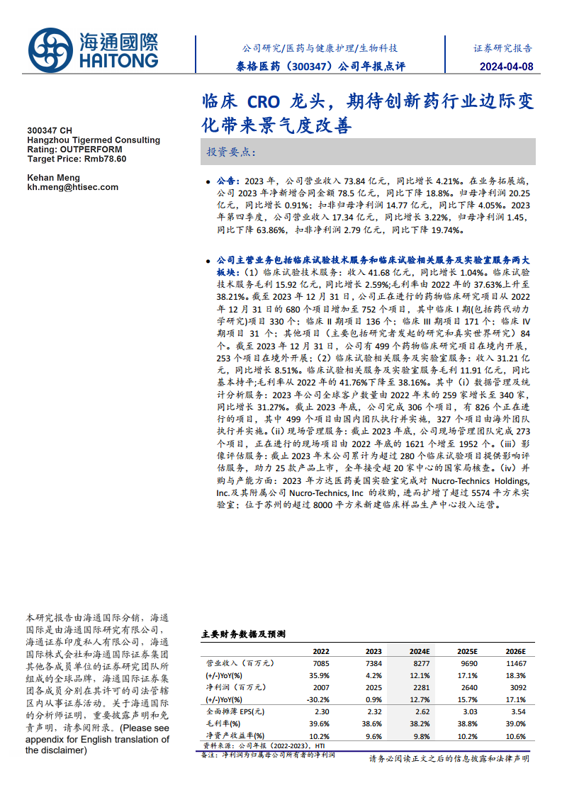 泰格医药作为临床CRO领域的龙头企业,在2023年面对行业挑战时,通过核心业务的稳健增长和战略性的全球布局,实现了营收和归母净利润的小幅增长。公司在临床试验技术服务方面项目数量持续增加,毛利率有所提升;在临床试验相关服务及实验室服务方面,通过客户拓展、并购和产能扩张,进一步增强了全球服务能力。尽管市场需求波动和客户融资压力导致短期盈利预测和目标价被下调,但公司积极应对,持续完善一体化研发服务平台,并加大新兴业务投入和全球市场拓展。分析师维持“优于大市”评级,期待创新药行业景气度改善带来的积极影响,但投资者仍需警惕行业竞争、研发需求变化及业务拓展不及预期等潜在风险。