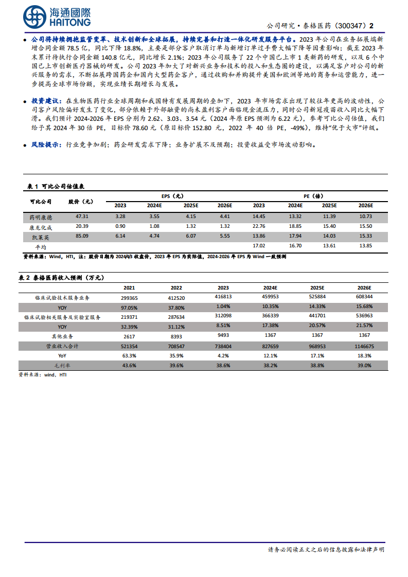 在生物医药行业全球周期和我国特有发展周期的叠加影响下,2023年市场需求波动性较往年更高,公司客户风险偏好发生变化,部分依赖外部融资的尚未盈利客户面临现金流压力,同时公司新冠疫苗收入同比大幅下滑。基于此,分析师预计泰格医药2024-2026年EPS分别为2.62、3.03、3.54元(原2024年EPS预测为6.22元,有显著下调)。参考可比公司估值,分析师给予其2024年30倍PE,目标价78.60元(原目标价152.80元,下调49%),维持“优于大市”评级。 风险提示包括:行业竞争加剧、药企研发需求下降、业务扩展不及预期以及投资收益受市场波动影响。