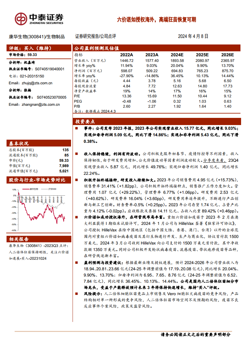 康华生物在2023年展现出稳健的营收增长和强劲的四季度业绩反弹,尽管净利润受研发投入和公允价值波动影响有所下滑。公司持续加大研发投入,积极拓展终端市场,并成功将六价诺如病毒疫苗授权海外,实现了国际化布局的重大突破。作为人二倍体狂犬病疫苗领域的龙头企业,康华生物的核心产品批签发保持正常,且在研管线日益丰富,为公司未来业绩增长提供了坚实基础。分析师维持“买入”评级,预计公司未来三年将保持快速增长,但投资者仍需关注市场竞争、产品结构单一、市场空间不及预期、不良反应事件及政策监管等潜在风险。