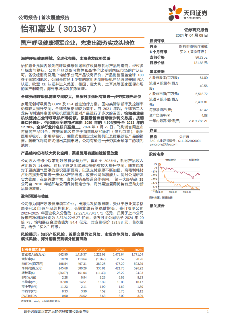 采用相对估值法,选取鱼跃医疗、理邦仪器、迈瑞医疗作为可比公司,并参考可比公司平均估值,给予怡和嘉业2024年20倍PE。据此,怡和嘉业的合理估值为84.4亿元,对应目标价131.88元。首次覆盖,给予“买入”评级。