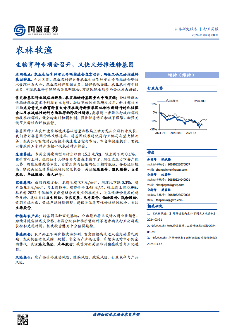 本周热点聚焦于农业生物育种重大专项推进会。4月3日,农业农村部召开会议,强调要确保“又快又好”推进转基因种业发展。会议肯定了转基因种业的战略地位和已取得的进展,并要求强化行政与技术指挥线,健全跨部门协调机制,以加快农业高水平科技自立自强。分析认为,转基因种业和良种竞争环境的改善将从总量和格局上助力龙头公司打开成长空间,预计转基因技术将大幅改善行业格局,龙头企业有望借此快速抢占空白市场,提升市占率,尤其看好以转基因玉米种业为核心的种业机会。