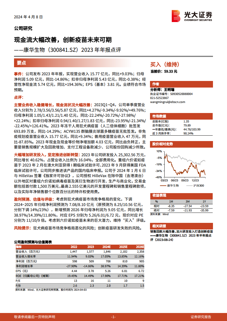 康华生物(300841):2023年年报点评:现金流大幅改善,创新疫苗未来可期