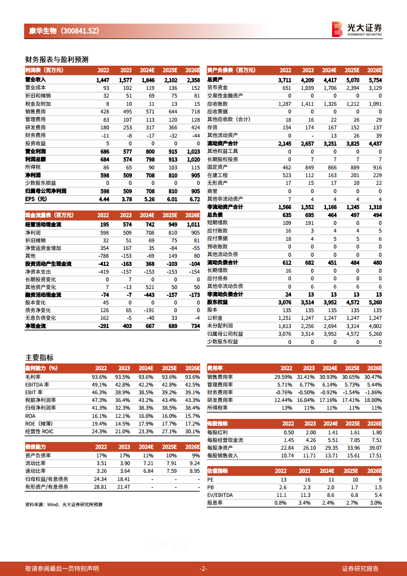 考虑到狂犬病疫苗市场竞争格局的变化,分析师下调了康华生物2024-2025年归母净利润预测至7.08亿元和8.10亿元(原预测分别为8.25亿元和10.56亿元,分别下调14%和23%),并新增预测2026年归母净利润为9.05亿元。预计2024-2026年归母净利润同比增长38.97%、14.39%和11.80%,对应EPS分别为5.26元、6.01元和6.72元。以当前股价计算,对应PE分别为11倍、10倍和9倍。鉴于六价诺如疫苗未来的巨大潜力,分析师维持“买入”评级。