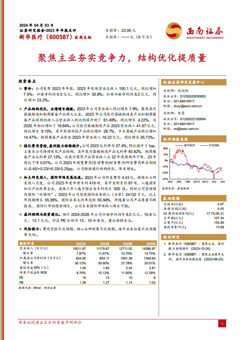 新华医疗(600587):聚焦主业夯实竞争力,结构优化提质量