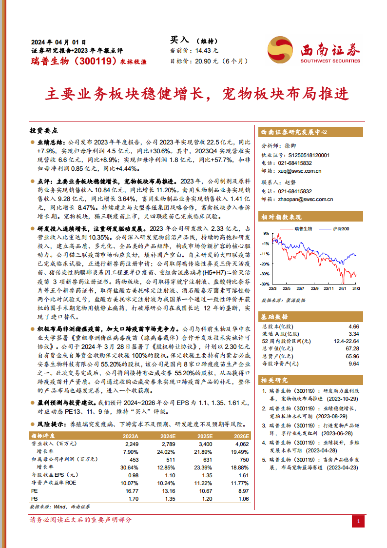 瑞普生物在2023年实现了稳健的业绩增长,营收和归母净利润均表现出色。公司通过持续高强度的研发投入,成功在宠物疫苗和药物领域取得突破,特别是猫三联疫苗的上市和犬四联疫苗的临床进展,以及盐酸右美托咪定注射液的进口替代,显著提升了其在宠物市场的竞争力。同时,公司积极通过合作与收购,战略性布局非洲猪瘟疫苗和口蹄疫疫苗市场,进一步完善了产品线,为未来增长提供了多元驱动力。分析师基于对公司业务增长的乐观预期,维持“买入”评级,并给出了明确的盈利预测和目标价,反映了市场对其未来发展潜力的认可。尽管存在养殖端疫病、下游需求不及预期及研发进度等风险,但公司在研发创新和市场拓展方面的积极举措,有望支撑其持续发展。