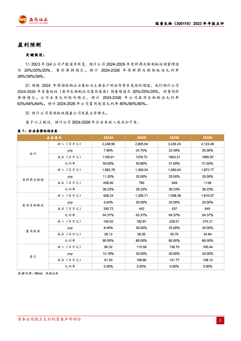 基于对公司未来发展的积极预期,西南证券预测瑞普生物2024年至2026年的每股收益(EPS)分别为1.1元、1.35元和1.61元。
