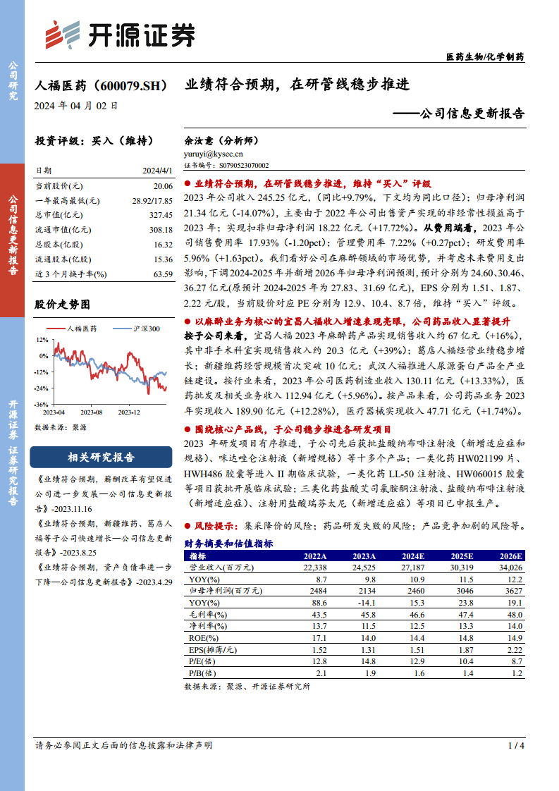 人福医药在2023年实现了符合预期的业绩表现,营业收入和扣非归母净利润均实现稳健增长。尽管归母净利润因非经常性损益同比有所下降,但公司核心业务的盈利能力持续增强。基于其在麻醉领域的市场优势和持续推进的研发管线,分析师维持了“买入”评级,并对未来盈利能力持乐观态度,尽管对短期盈利预测进行了调整。