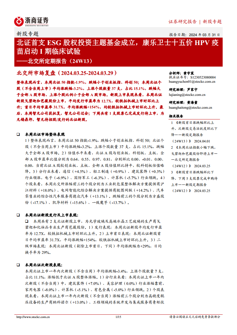 北交所定期报告(24W13):北证首支ESG股权投资主题基金成立,康乐卫士十五价HPV疫苗启动I期临床试验