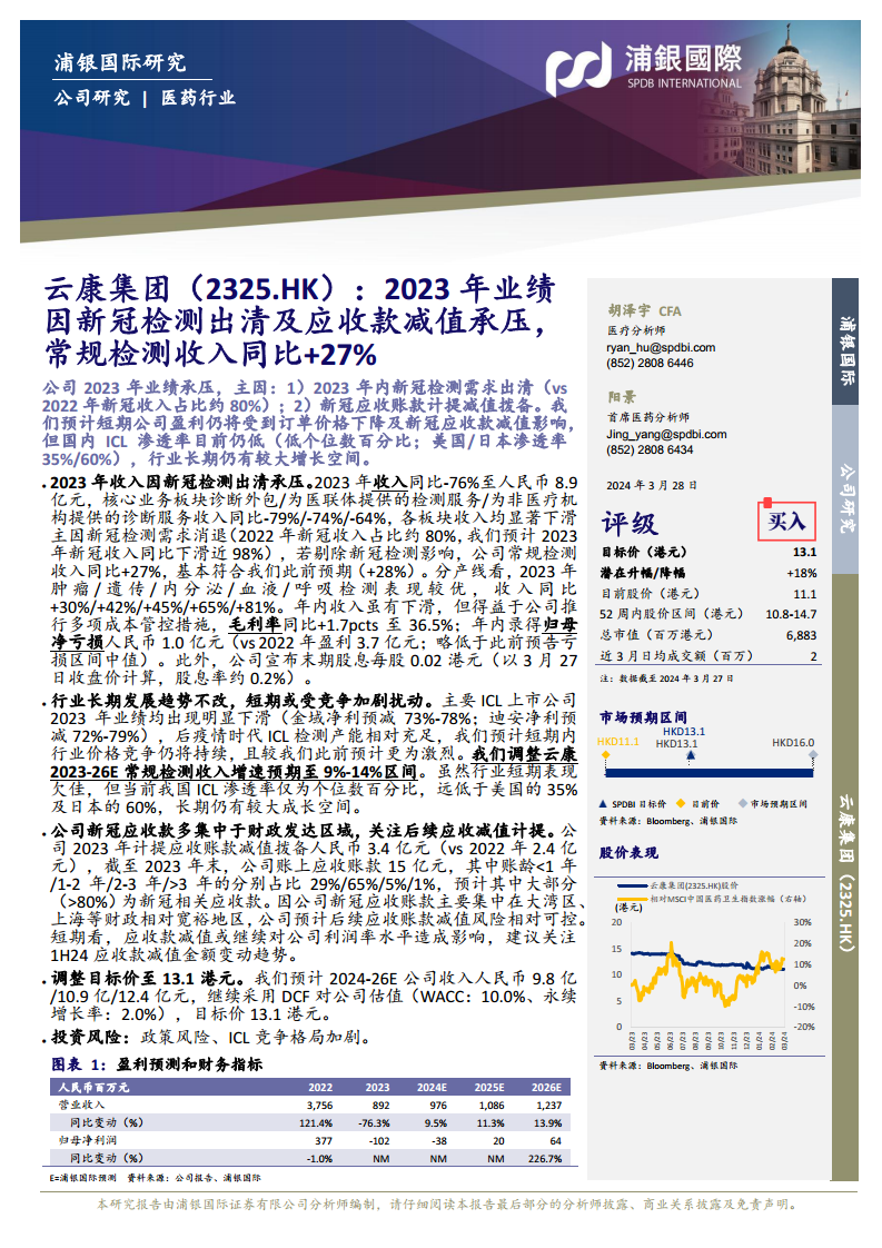 云康集团(2325.HK)在2023年面临严峻的业绩挑战,主要原因在于新冠检测需求的全面出清以及由此产生的大额应收账款减值拨备。2022年,新冠检测业务曾贡献公司总收入的约80%,而2023年该部分收入同比骤降近98%,直接导致公司总收入同比大幅下滑76%至人民币8.9亿元。受此影响,公司在2023年录得归母净亏损人民币1.0亿元,与2022年的盈利3.7亿元形成鲜明对比。尽管整体业绩承压,但若剔除新冠检测业务的影响,公司常规检测收入实现了27%的稳健同比增长,基本符合浦银国际此前28%的预期,这充分展现了公司核心业务的韧性和市场需求。特别是在肿瘤、遗传、内分泌、血液和呼吸检测等细分领域,收入增长表现尤为突出,同比增幅分别达到30%、42%、45%、65%和81%,印证了公司在专业检测服务领域的持续发展能力。此外,公司通过积极实施多项成本管控措施,成功将毛利率同比提升1.7个百分点至36.5%,在一定程度上缓解了收入下滑对盈利能力的冲击。
