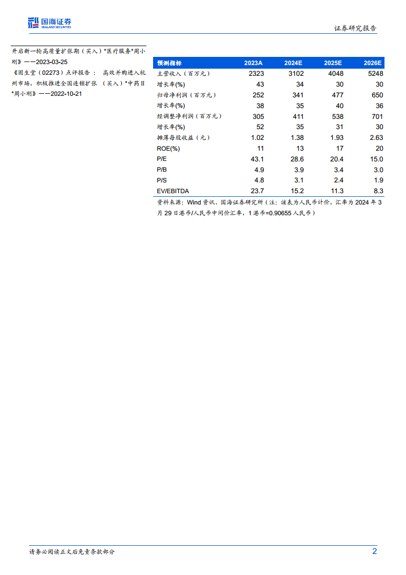 固生堂在2023年展现了强劲的业绩增长和高质量的发展态势,通过就诊量、自有医生贡献及老店的内生增长等多维度数据,印证了其作为中医馆龙头的市场地位。展望2024年,公司计划进一步扩大门店网络、拓展新城市、加强研发并启动国际化布局,预示着业务将持续高质量扩张。同时,公司通过积极的股份回购和特别派息,彰显了对投资者回报的重视和对未来发展的坚定信心。基于稳健的财务表现和清晰的增长战略,分析师维持了“买入”评级,并对未来三年的营收和利润增长持乐观预期,尽管仍需关注业务扩张、人才、竞争及中药价格波动等潜在风险。