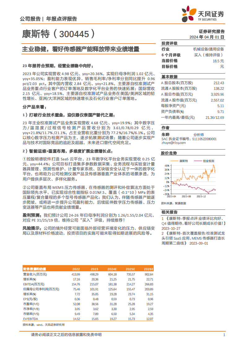 康斯特2023年业绩表现符合预期,营收和归母净利润均实现稳健增长,盈利能力持续提升。公司核心校准测试产品业务在国产替代趋势下展现出强劲增长潜力,特别是数字压力检测产品。同时,公司积极拓展新业务,数字化SaaS云平台业务快速发展,并在MEMS压力传感器领域取得国际领先的技术突破,有望在产能释放后成为新的业绩增长点。综合来看,公司基本面稳健,未来增长可期,维持“买入”评级。