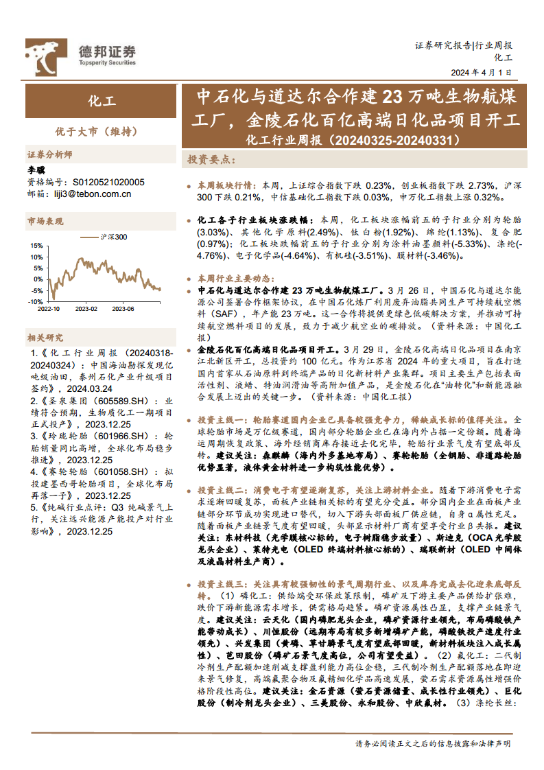 化工行业周报:中石化与道达尔合作建23万吨生物航煤工厂,金陵石化百亿高端日化品项目开工