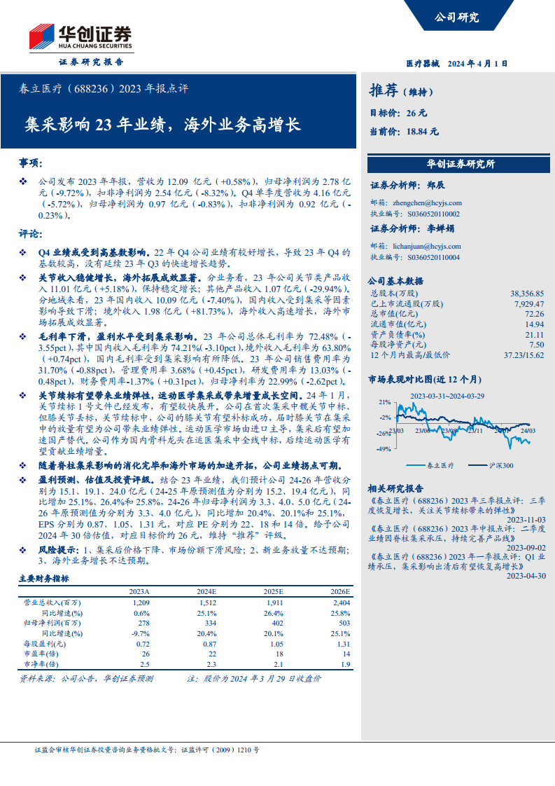 春立医疗2023年业绩受到国家集中采购政策的显著影响,营收增速放缓,归母净利润和扣非净利润均出现下滑。尽管国内市场收入因集采而承压,但公司在海外市场的拓展表现亮眼,境外收入实现高速增长,成为业绩的重要支撑。核心关节类产品收入保持稳健增长,显示出其市场韧性。毛利率受集采影响有所下降,但公司通过费用控制和海外业务的增长,努力维持盈利水平。展望未来,关节续标有望为公司膝关节产品带来放量机会,而运动医学集采则将加速国产替代并为公司贡献新的业绩增量。随着脊柱集采影响的逐步消化和海外市场的持续开拓,春立医疗的业绩有望迎来拐点。华创证券维持“推荐”评级,并对公司未来三年的营收和净利润增长持乐观预期,但同时提示了集采、新业务放量及海外业务增长不达预期等潜在风险。