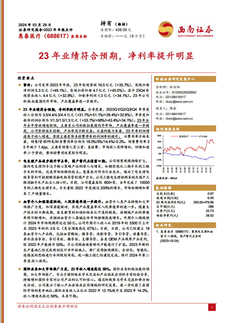 惠泰医疗(688617):23年业绩符合预期,净利率提升明显