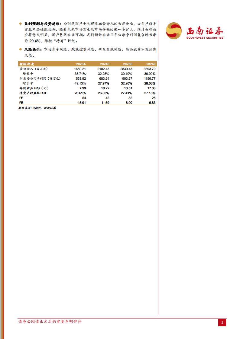 惠泰医疗在2023年取得了符合预期的业绩,营收和净利润均实现高速增长,净利率显著提升,这主要得益于公司积极的市场拓展和有效的成本控制。在核心业务方面,电生理产品在国产替代浪潮中市场份额持续扩大,三维手术量实现翻倍增长;血管介入业务通过渠道深化和产品线丰富,外周介入收入实现强劲增长。此外,国际业务也表现出强劲的增长势头。尽管面临市场竞争、政策控费、研发失败和新品放量不及预期等风险,但公司作为国产电生理及血管介入领域的头部企业,其丰富的产品线和优异的产品性能,使其在未来市场需求扩大和国产替代深化中具备持续增长潜力。报告维持“持有”评级,并预计未来三年归母净利润将保持近30%的复合增长。
