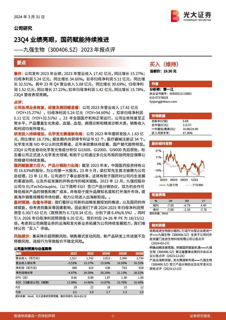 九强生物在2023年展现出强劲的业绩增长和显著的经营回暖,营业收入和归母净利润均实现两位数增长。公司通过持续的研发投入,成功切入化学发光这一高增长赛道,并获得了多款新产品的注册批准。作为第一大股东,国药集团的战略赋能为公司带来了渠道协同和并购合作的巨大潜力。同时,公司积极拓展海外市场,通过与国际伙伴的分销协议,开启了产品出海的新篇章。尽管面临集采等行业风险,但公司在战略转型和国际化布局方面的努力,以及国药的持续支持,为其未来的可持续发展奠定了坚实基础。光大证券研究所维持“买入”评级,并对公司未来盈利能力持乐观态度。