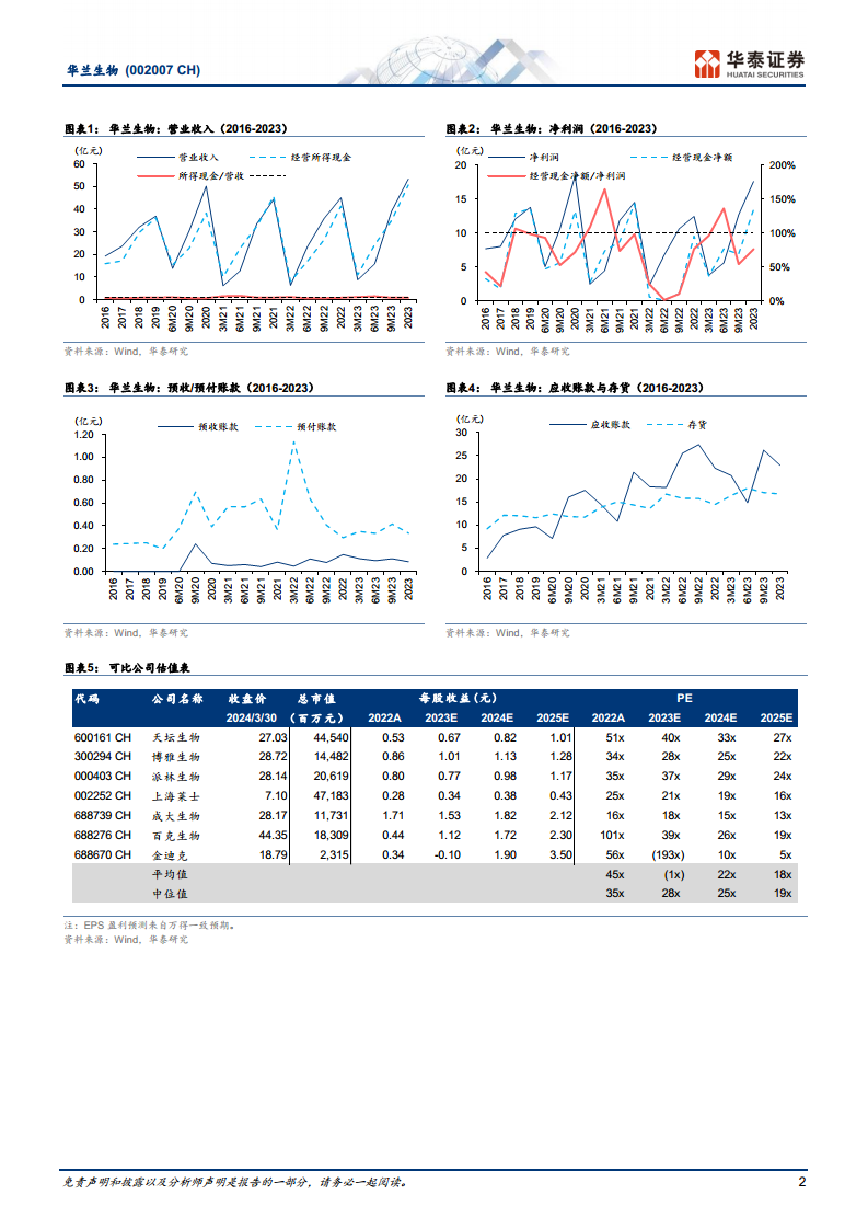 华兰生物在2023年实现了显著的业绩增长,全年营业收入和归母净利润分别同比增长18%和38%,尤其在第四季度,归母净利润同比大幅增长135%,显示出公司强大的盈利能力和市场恢复力。展望未来,华泰研究预计公司在2024年至2026年期间,归母净利润将保持约21%的年复合增长率,预示着持续的增长潜力和稳健的发展前景。