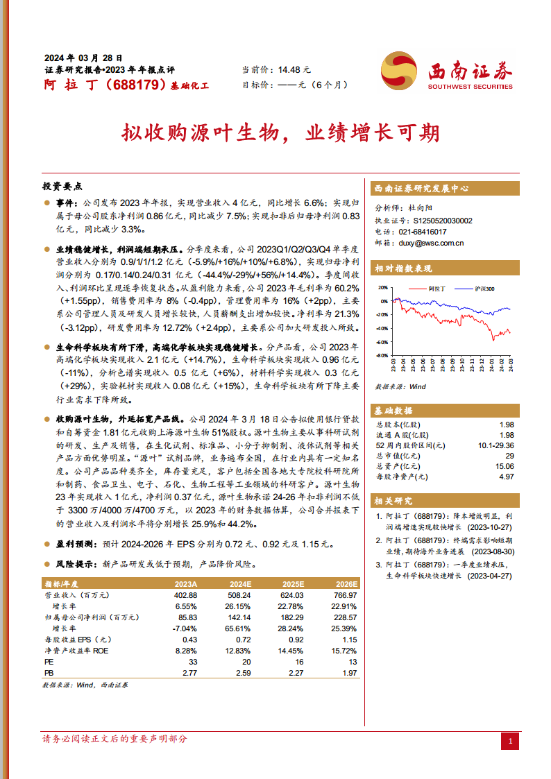 2024年3月18日,公司公告拟使用银行贷款和自筹资金1.81亿元收购上海源叶生物51%股权。源叶生物专注于科研试剂的研发、生产及销售,在生化试剂、标准品、小分子抑制剂、液体试剂等领域具有显著优势,并拥有遍布全国的客户群。源叶生物2023年实现收入1亿元,净利润0.37亿元,并承诺2024-2026年扣非利润分别不低于3300万、4000万、4700万元。此次收购预计将使公司合并报表下的营业收入及利润水平分别增长25.9%和44.2%,显著拓宽公司产品线并增强市场竞争力。