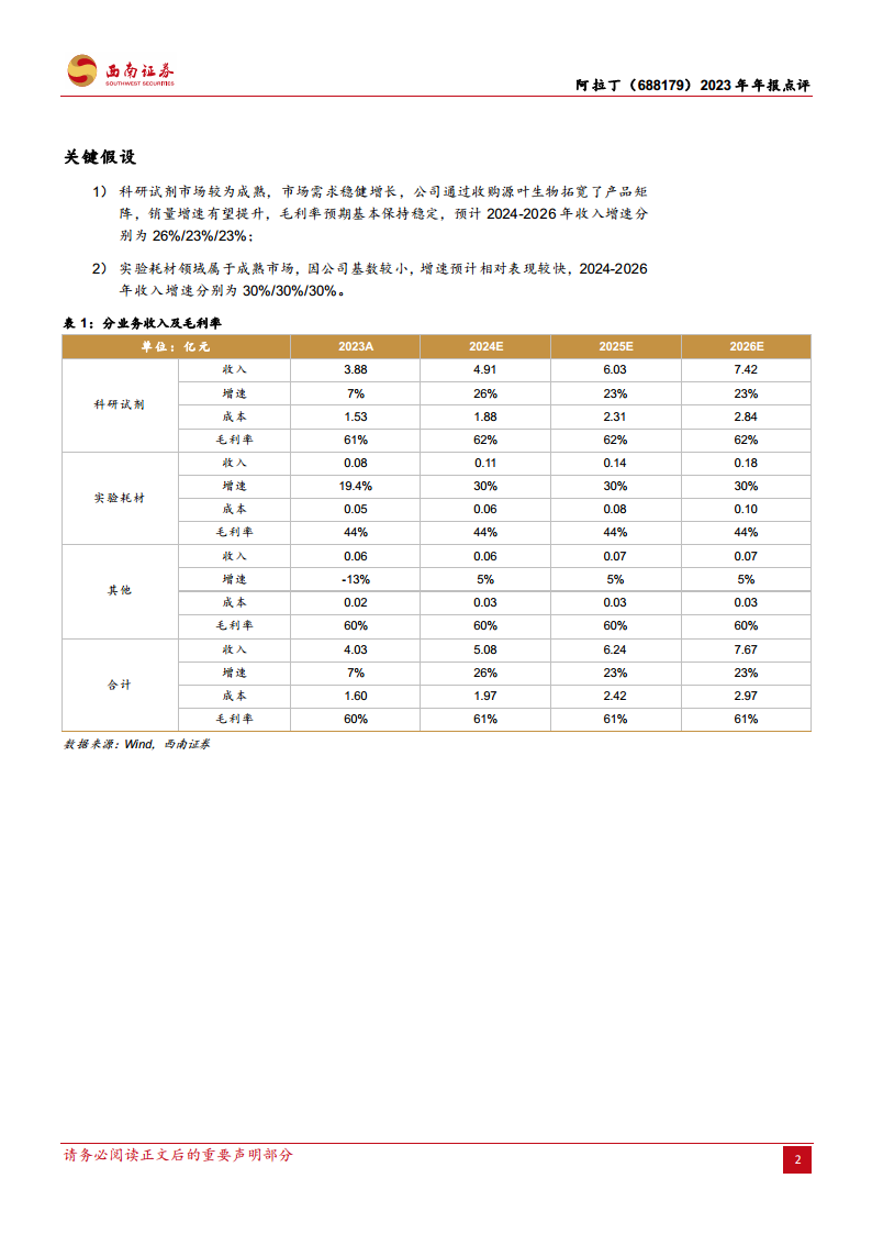报告基于以下关键假设进行预测:科研试剂市场需求稳健增长,公司通过收购源叶生物拓宽产品矩阵,销量增速有望提升,毛利率预计保持稳定,预计2024-2026年收入增速分别为26%、23%、23%。实验耗材领域作为成熟市场,因公司基数较小,预计增速相对较快,2024-2026年收入增速分别为30%、30%、30%。