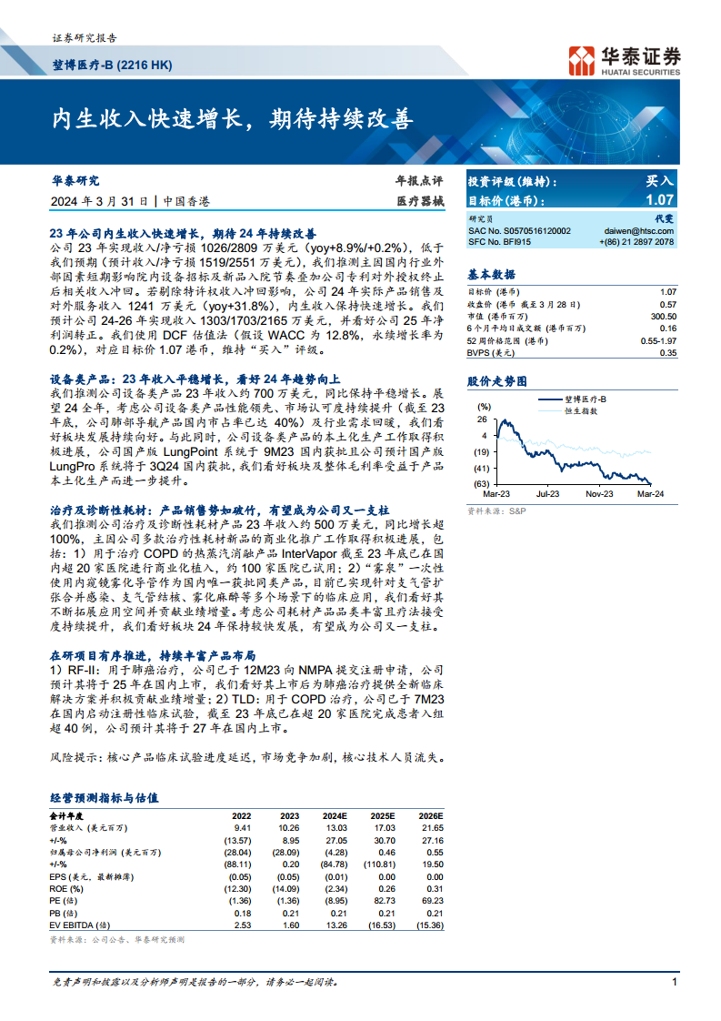 堃博医疗-B在2023年虽受外部因素影响导致整体业绩低于预期,但其核心产品销售及对外服务收入实现了31.8%的快速内生增长,展现出强大的业务韧性。公司在设备类产品(如肺部导航系统国内市占率达40%)和治疗及诊断性耗材(如InterVapor和“雾泉”导管)方面均取得显著进展,并积极推进产品本土化生产,预计将有效提升毛利率。随着RF-II和TLD等在研项目的有序推进,公司产品管线将持续丰富。华泰研究预测堃博医疗-B的收入将在2024-2026年持续增长,并有望在2025年实现净利润转正。基于DCF估值法,维持“买入”评级,目标价1.07港币,反映了对公司长期发展潜力和盈利改善的积极预期。投资者需关注临床试验进度、市场竞争及人才流失等风险。