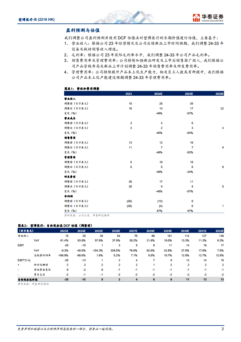 盈利预测与估值: 华泰研究根据公司2023年经营情况及后续新品上市时间预期,调整了2024-2033年设备及耗材销售收入增速、产品毛利率、销售费用率、研发费用率和管理费用率。调整后,预计公司2024-2026年收入分别为13.03、17.03和21.65百万美元,并看好公司在2025年实现净利润转正(预计2025年净利润0.46百万美元)。采用DCF估值法(假设WACC为12.8%,永续增长率为0.2%),对应目标价1.07港币,维持“买入”评级。