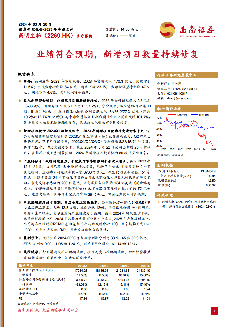 基于对公司未来项目数量、平均单价、产能爬坡及毛利率的假设,西南证券预计药明生物2024-2026年归母净利润分别为38.1亿元、45亿元和52.9亿元人民币,对应的每股收益(EPS)分别为0.90元、1.06元和1.24元。预测市盈率(PE)分别为16倍、14倍和12倍。 报告同时提示了多项风险,包括行业增速或不及预期风险、项目进度不及预期风险、对外投资收益波动性风险、政策风险以及汇率波动风险等,提醒投资者关注潜在的不确定性。