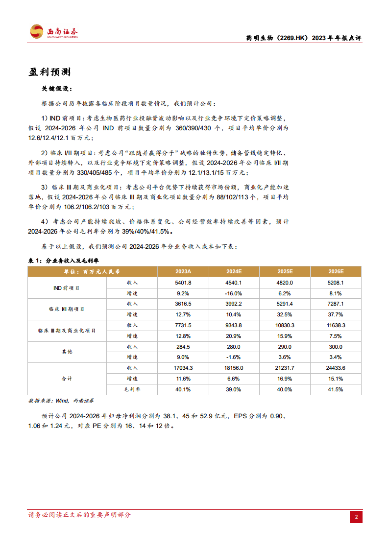 从业务阶段来看,公司在临床前、临床早期(I期、II期)以及临床III期与商业化阶段均实现了稳健增长。临床前阶段收入为54亿元人民币,同比增长9.2%;临床早期阶段收入为36.2亿元人民币,同比增长12.7%;临床III期与商业化阶段收入为77.3亿元人民币,同比增长12.8%。值得注意的是,非新冠临床III期和商业化收入同比激增101.7%,这反映了公司在后期项目转化和商业化生产方面的强大能力和市场份额的持续扩大。随着欧美生物技术融资环境触底反弹,预计临床前阶段的收入增长有望逐步恢复,为公司未来发展提供新的增长点。毛利率方面,2023年为40.1%,预计2024-2026年将维持在39.0%至41.5%之间,显示出公司在成本控制和运营效率方面的持续优化。