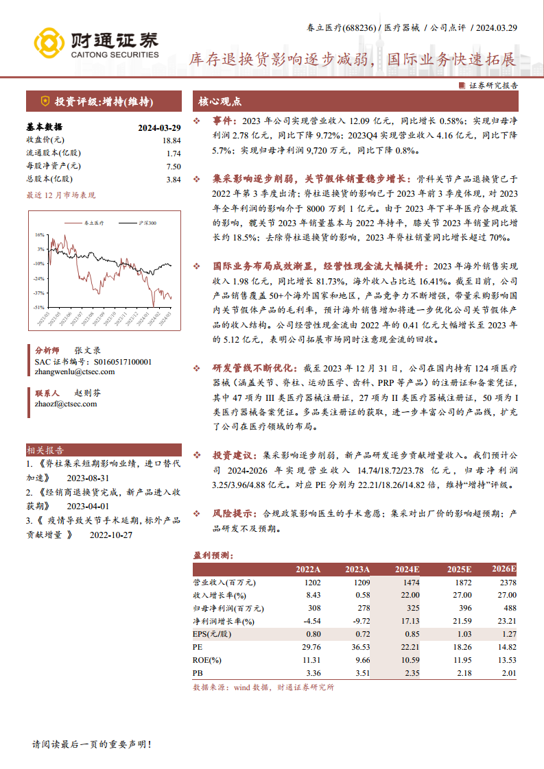 春立医疗在2023年度的财务表现短期承压,营业收入微增0.58%至12.09亿元,而归母净利润同比下降9.72%至2.78亿元,主要受历史库存退换货(特别是脊柱产品在2023年前三季度带来的8000万至1亿元利润影响)及下半年医疗合规政策的影响。然而,随着骨科关节产品退换货影响的逐步出清,以及在剔除这些一次性因素后,膝关节和脊柱产品销量分别实现18.5%和超过70%的同比增长,表明集采带来的短期负面影响正逐步减弱,公司核心业务展现出恢复性增长的韧性。