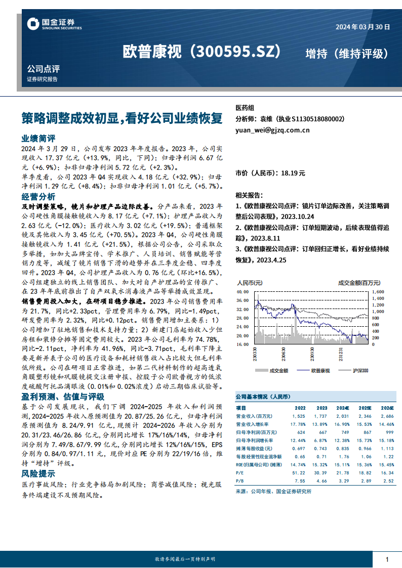 2023年,公司在复杂市场环境下实现了收入和归母净利润的稳健增长,尤其第四季度业绩显著回升,显示出公司在产品策略调整和市场推广方面的积极成效。硬性角膜接触镜销售下滑趋势得到遏制并实现回升,护理产品也通过线上渠道和新品推出实现边际改善。尽管销售费用投入加大导致毛利率和净利率有所承压,但公司在研项目稳步推进,为未来增长奠定基础。分析师下调了短期盈利预测但仍维持“增持”评级,表明对公司长期发展潜力持乐观态度。然而,投资者仍需密切关注医疗事故、行业竞争、商誉减值以及视光服务终端建设等潜在风险。