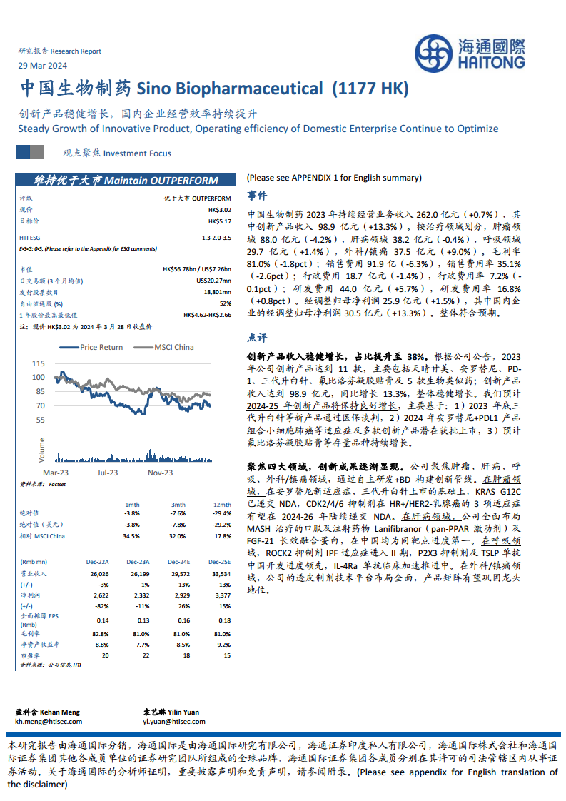中国生物制药在2023年通过创新产品实现稳健增长,创新收入占比显著提升,成为业绩核心驱动力。公司在肿瘤、肝病、呼吸、外科/镇痛四大核心治疗领域构建了丰富的创新管线,多款产品进展领先,为未来发展奠定基础。同时,公司持续优化运营效率,销售管理费用率下降,营销人均产出提升,研发投入策略也趋于成熟,创新药研发占比提高。尽管盈利预测有所调整,但基于其强大的创新能力和效率提升,分析师维持“优于大市”的投资评级,认为公司具备持续增长和利润率改善的潜力。