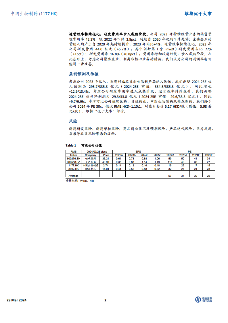 基于可比公司(恒瑞医药、贝达药业、中国生物制药及翰森制药)的估值水平,分析师给予公司2024年30倍市盈率(PE),并假设人民币兑港币汇率为1.10:1,对应目标价为5.17港元/股(原目标价为5.98港元/股)。尽管目标价有所调整,但分析师维持对中国生物制药“优于大市”的投资评级,反映了对公司未来增长潜力和市场表现的积极预期。