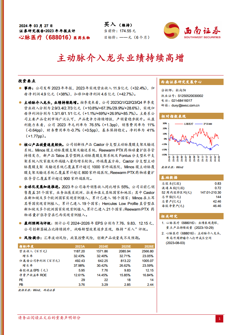 心脉医疗在2023年取得了令人瞩目的业绩增长,其营业收入和净利润均实现大幅提升,这主要得益于公司在主动脉介入领域的核心竞争力、创新产品的快速市场渗透以及成功的全球化战略布局。公司盈利能力持续优化,毛利率和净利率均有所提升。展望未来,尽管面临汇率波动、政策控费和新产品放量不及预期等潜在风险,但基于其强大的产品管线、持续的创新能力和积极的国际市场拓展,公司预计将保持稳健的增长态势。西南证券维持“买入”评级,肯定了公司未来的发展潜力。