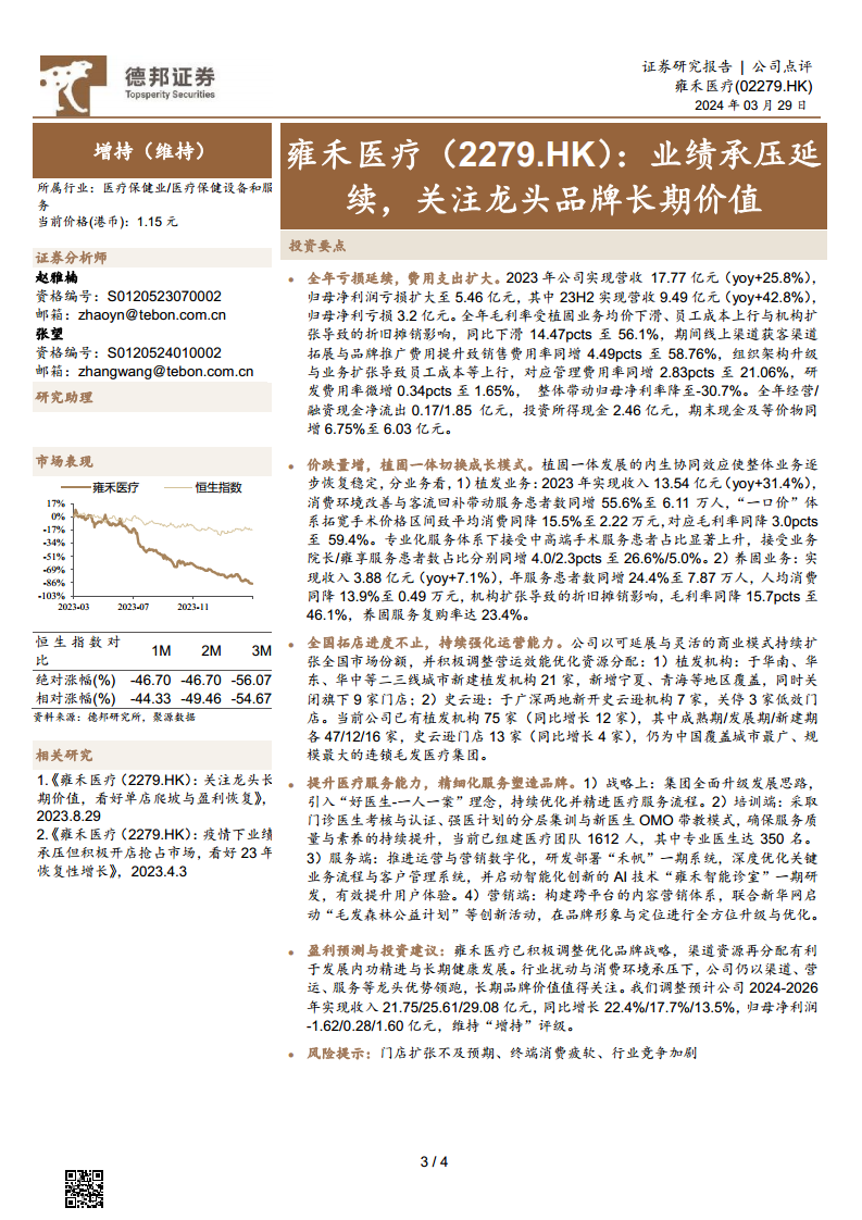 雍禾医疗在2023年面临营收增长但亏损扩大的挑战,主要源于毛利率下降和销售、管理费用的显著增加。为应对市场变化,公司正积极转型“植固一体”的综合服务模式,并取得了患者服务量和全国门店网络的扩张。同时,公司致力于提升医疗服务能力,通过战略升级、专业培训、数字化运营和创新营销来塑造品牌。分析师对公司长期价值持乐观态度,预计其将在2025年实现盈利,并维持“增持”评级,但提醒投资者关注门店扩张、消费环境及行业竞争等潜在风险。