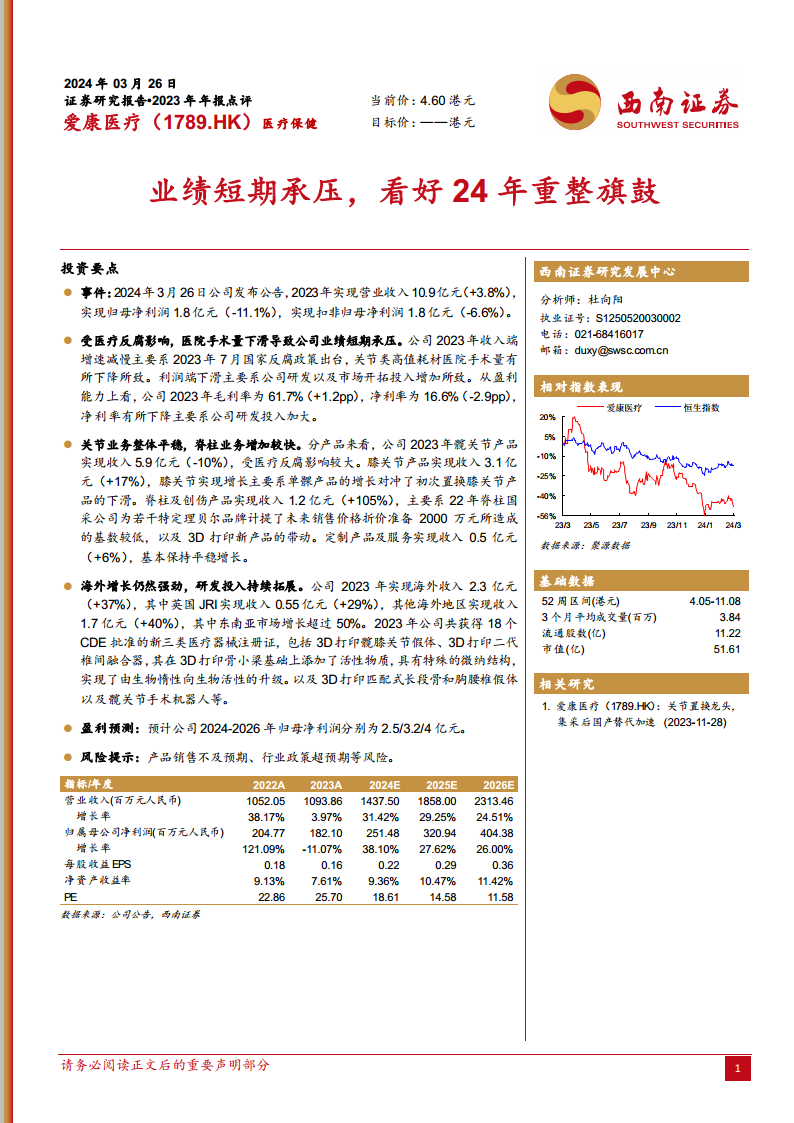 爱康医疗(01789):业绩短期承压,看好24年重整旗鼓