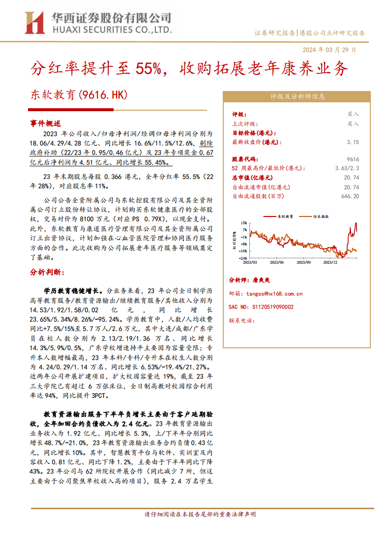 东软教育在2023年展现了稳健的财务表现,核心学历教育业务持续增长,校园利用率显著提升,同时通过高分红政策积极回馈股东。公司战略性地收购东软健康医疗并拓展老年康养业务,旨在构建新的增长引擎,尽管短期内可能对利润构成压力,但长期来看有望与现有教育业务形成协同,并为公司带来更广阔的发展空间。分析师维持“买入”评级,并对公司未来各业务板块的增长潜力持乐观态度,认为其具备长期投资价值。