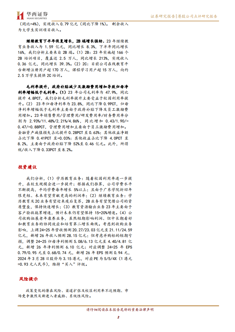 分析师维持“买入”评级。预计学历教育业务将随着校园利用率提升和学费增长(预计每年增长5%以上)而持续发展。继续教育业务有望在疫后复苏,2B业务凭借资质壁垒保持快速增长。教育资源输出业务预计未来仍能保持15-20%的增速。考虑到收购老年康养业务短期内可能带来的亏损影响,分析师上调了2024-2025年营收预测至21.11/24.59亿元,并新增2026年收入预测28.15亿元;同时下调了2024-2025年归母净利润预测至4.40/4.81亿元,新增2026年净利润预测6.10亿元。对应调整后的2024-2026年EPS分别为0.68/0.74/0.94元。风险提示包括政策变化、渠道扩张及校区利用率不达预期、市场竞争激烈以及系统性风险。