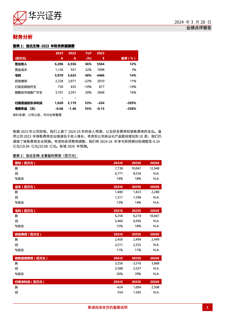 公司经营效率持续提升,2023年亏损同比大幅收窄53%,主要得益于毛利率的上升和各项费用支出比率的下降。在战略层面,心血管和代谢(CVM)领域被确立为新的利润增长点,首款CVM新药托莱西单抗已获批上市,而重磅产品玛仕度肽(GLP-1/GCGR双激动剂)的减重适应症即将提交上市申请,有望在2025年上市,进一步驱动公司业绩增长。基于其强劲的增长势能,分析师重申“买入”评级,并认为公司理应获得估值溢价。
