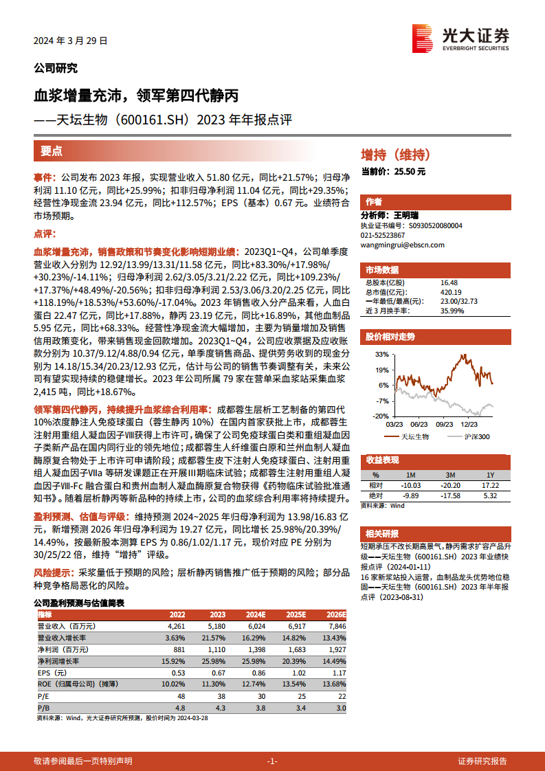 分析师维持对天坛生物2024年至2025年归母净利润的预测,分别为13.98亿元和16.83亿元,并新增预测2026年归母净利润为19.27亿元。预计2024-2026年归母净利润同比增长率分别为25.98%、20.39%和14.49%。按最新股本测算,对应每股收益(EPS)分别为0.86元、1.02元和1.17元。